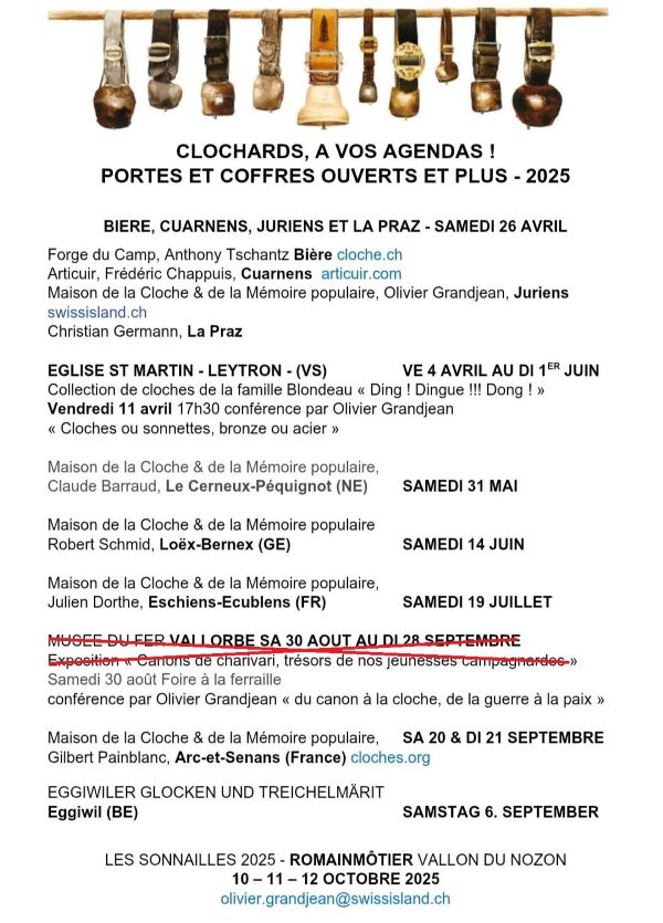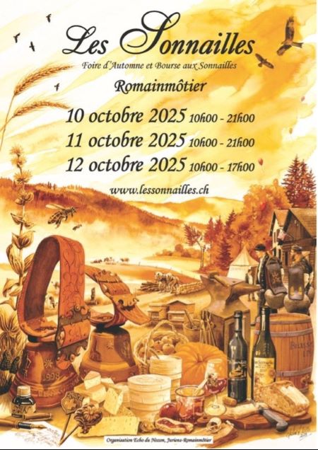 La 26ème édition des Sonnailles, Foire d'Automne et Bourse aux Sonnailles aura lieu à Romainmotier, Suisse, les 10 11 et 12 octobre 2025. Je serai présent avec un stand comme chaque année